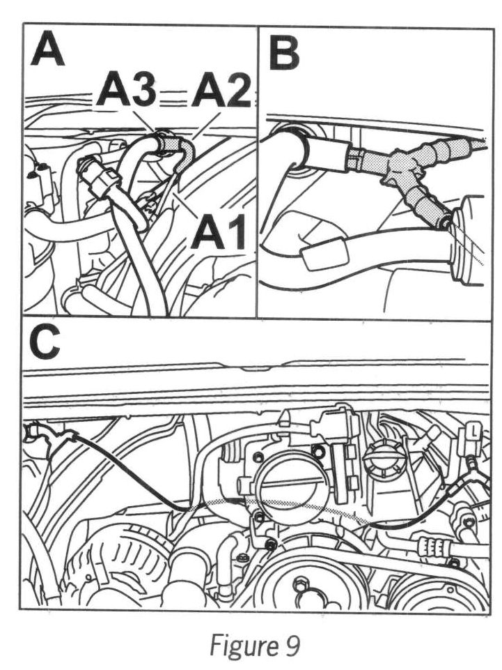 4.4 Pull line (Tekalan, --> Figure 9-A1-) for the electric changeover valve (resonance tube) with the protective tube (--> Figure 9 -A2-) until it emerges out of the T-piece (--> Figure 9 -A3-; vacuum pump line for engine/brake booster).