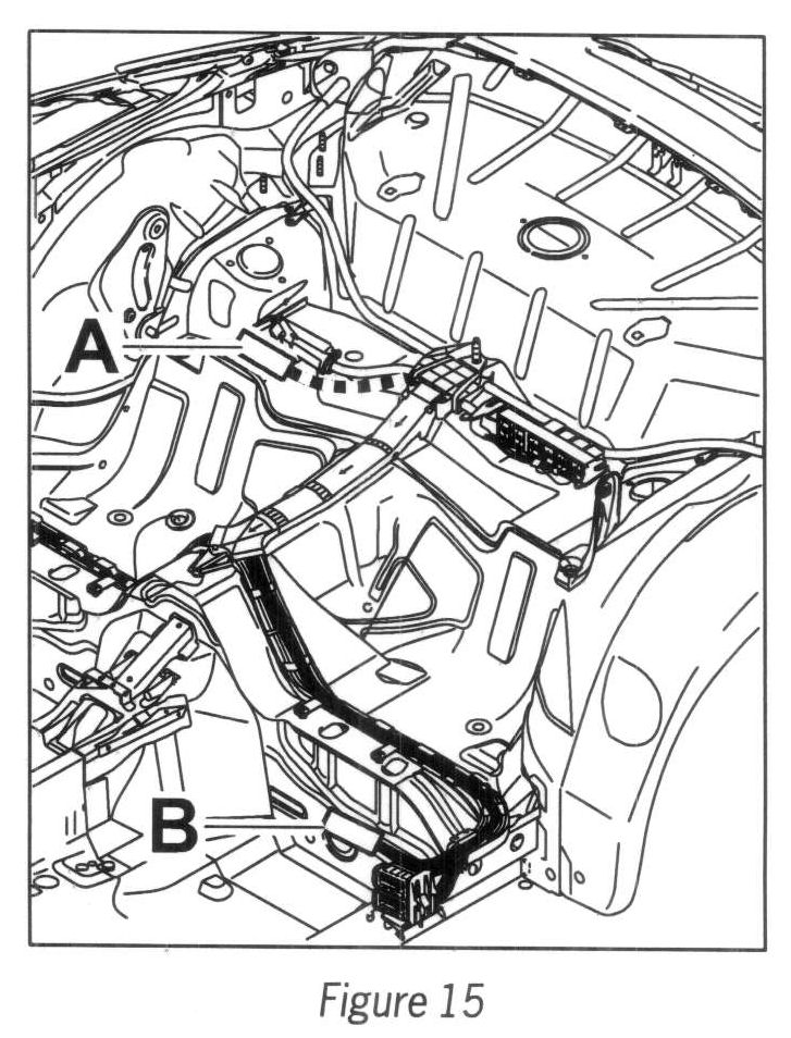 DME control unit (on the Coupe': see --> Figure 15-A-) --> node point for rear-seat floorpan assembly --> left side panel --> left B-pillar (--> Figure 15-B-).