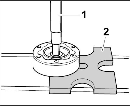 2.2. Press off CV joint using special tools -1, 2- plunger vw 408 a and pressure plate vw 401 a. Push dust bellows and bellows holder to the inner side of the drive shaft so that the CV joint can be pressed off.