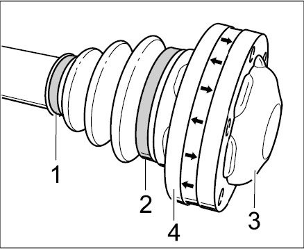 In the case of monobloc drive shafts -2-, the position of the bellows -arrows- must be marked for reinstallation before disassembling the shaft. This ensures that the bellows will be reinstalled in the correct position. Use a colored pen or fabric tape to mark the position.