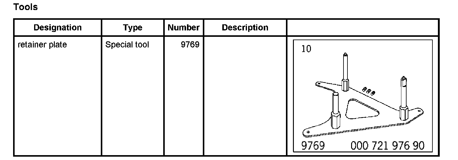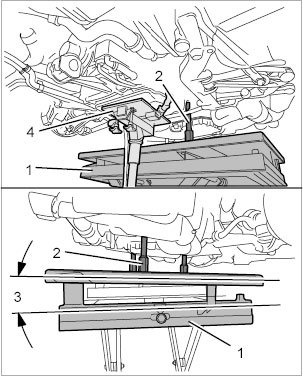 1. Position unit elevating platform -1- under the vehicle, secure retainer plate 9769 ( -2- ) on the unit elevating platform and insert the mounting pegs of the retainer plate 9769 into the mounting bores on the engine and press in with a slight degree of pretension. The unit elevating platform must be positioned slightly diagonally using the adjustment controls so that the bores are directly parallel.