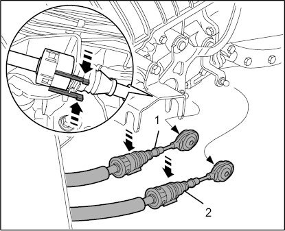 2. Engage shift -1- (grey end piece) and selector cable -2- (blue end piece) into support bracket for transmission and press end pieces onto ball heads.