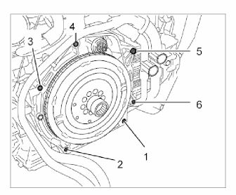 When you screw in and tighten the flange screws between the transmission and engine, the screws -1 and 2- must be screwed in and tightened last. If this is not done, the engine housing can be damaged irreparably.