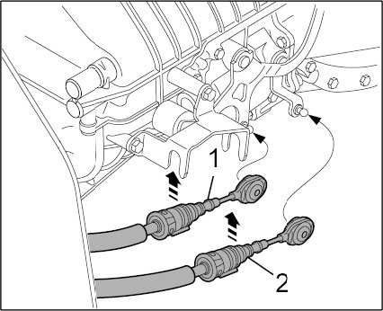 5. Disconnect shift -1- and selection cables -2- from the transmission.