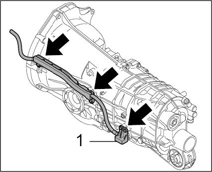 3. Fit the electric cable (positive lead). Do this by fitting the holder on the transmission -arrows- and connecting cables in the B-Plus box -1-.