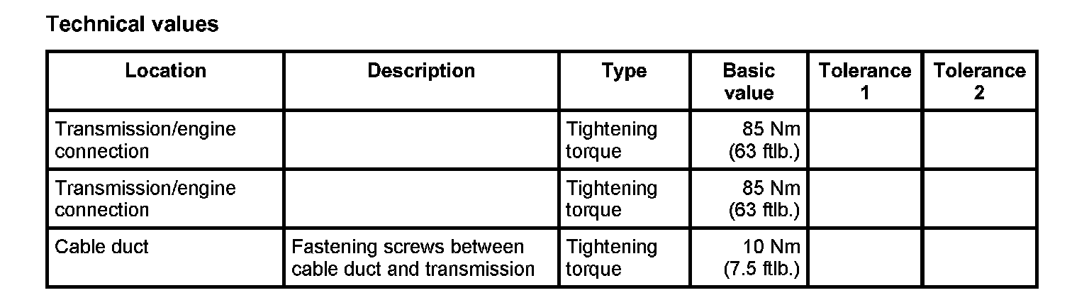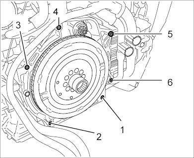 When you screw in and tighten the flange screws between the transmission and engine, the screws -1 and 2- must be screwed in and tightened last. If this is not done, the engine housing can be damaged irreparably.