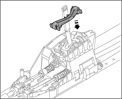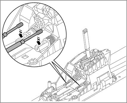 3. Clip in supports on the gearshift bracket. The support with the blue hinged tube must be fitted on the left and the support with the black hinged tube must be fitted on the right.