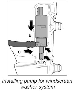 3. Connect the water pipe to the connections at the pump for the windscreen washer system -arrow C-.