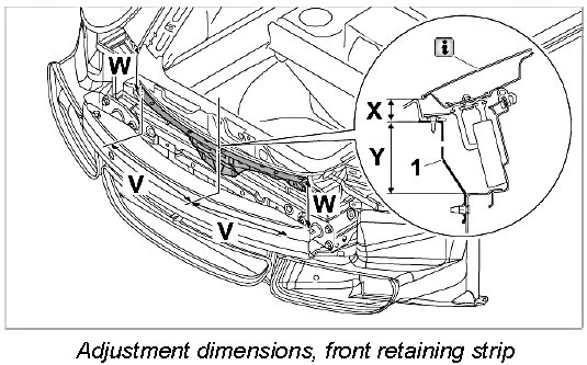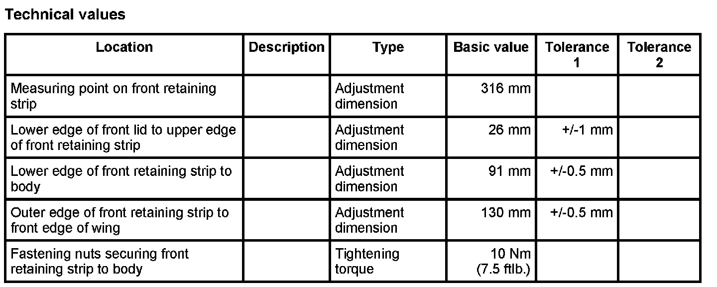 - In order to reduce adjustment work to a minimum when assembling the front spoiler, the front retaining strip must be aligned with the lower edge of the lid according to the dimensions shown.