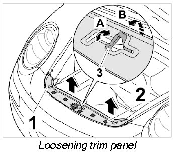 3. Actuate lid-release lever -3- in -direction of arrow A- and fit trim panel for lock support -1- (-arrow B-).