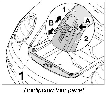4. Lift cover for lock support up slightly -1-, release the locking tab at the side from below -arrow A- and pull it out of the cover for the wing flange -2- (-arrows B-).