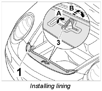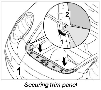 5. Slide trim panel for lock support -1- with the soft lip under the luggage compartment seal and press on Velcro fasteners.