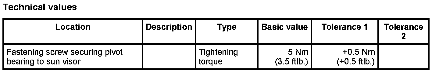 2. Secure the pivot bearing for the sun visor -4- with the fastening screw -2-. Tightening torque: 5 Nm (3.5 ftlb.)+0.5 Nm (+0.5 ftlb.)