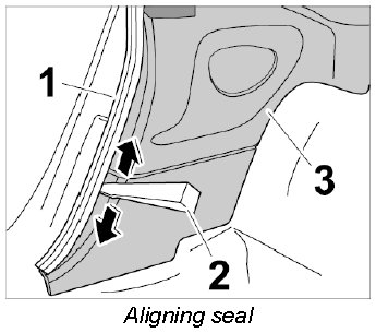 6. Lift up the pillar seal -1- using a plastic spatula -2- along the side trim panel -3-.