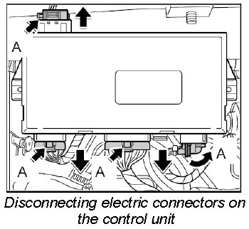 2. Release electric connectors -A- on the control unit and disconnect them.
