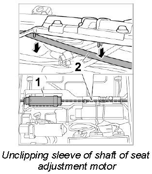 1. Unclip sleeve of long drive shaft -2- of seat adjustment motor -1- at the support.