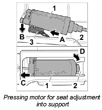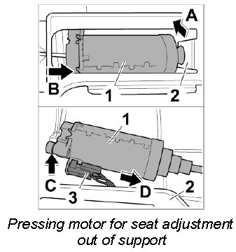4. Pull motor for seat adjustment -1- forward under the support -2- (-arrow C-) and pull off connector -3- (-arrow D-).