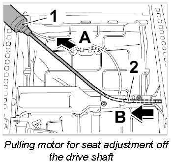 3. Pull motor for seat adjustment -1- off the short drive shaft -arrow B-.