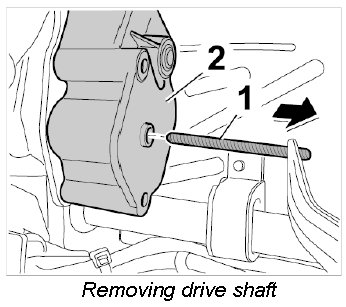 6. Pull the long drive shaft -2- out of the gear mount -arrow B- and check for damage.
