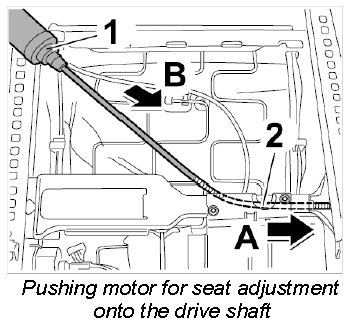 5. Push motor for seat adjustment -1- under the support -2- (-arrow B-).