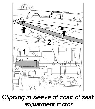 8. Clip in sleeve of long drive shaft -2- of seat adjustment motor -1- on the support.