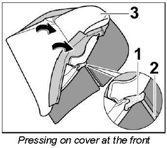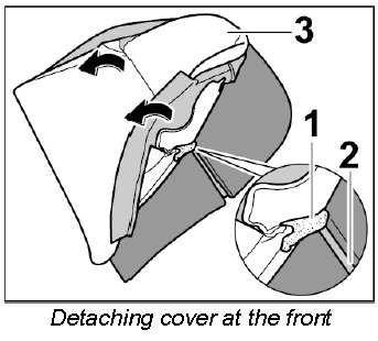 3. Carefully detach Velcro strip -1- on the cover from the Velcro fastener on the front of the padding -2- (-arrows-).