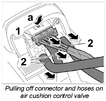 3. Release connector -1- on air cushion control valve -arrow a- and pull it off.