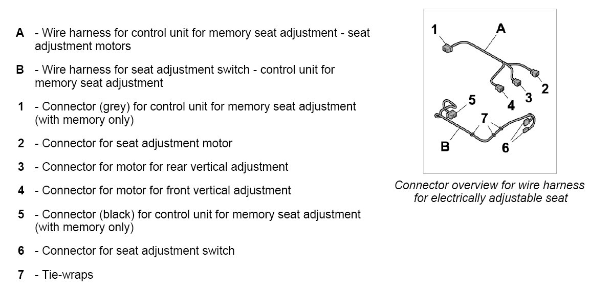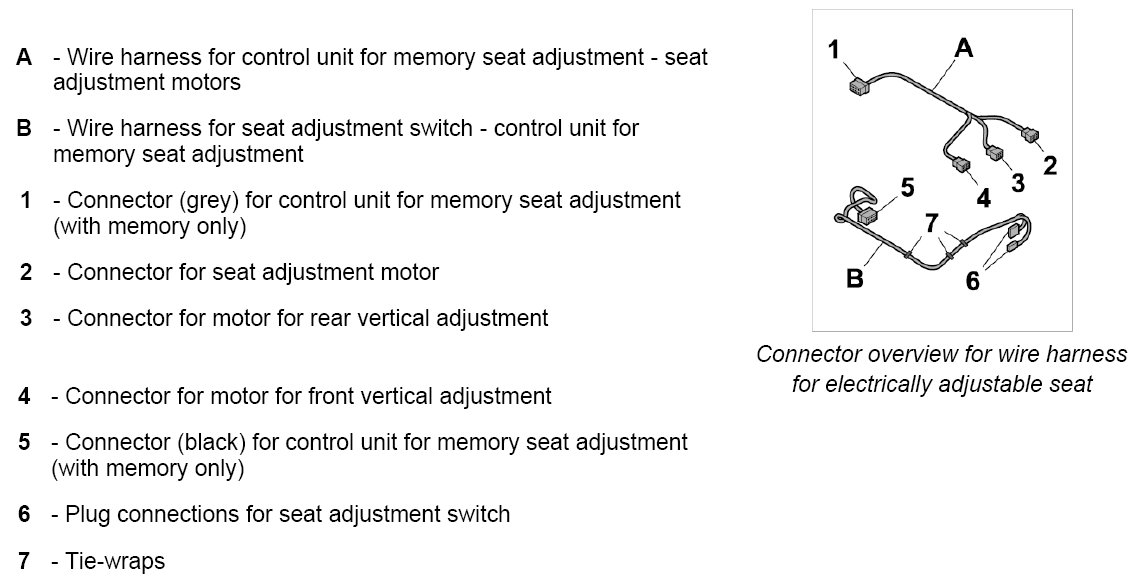 INFORMATION: This description covers the two-piece wire harness for an electrically adjustable seat with memory. Some plug connections will not be present on a single-piece wire harness without memory.