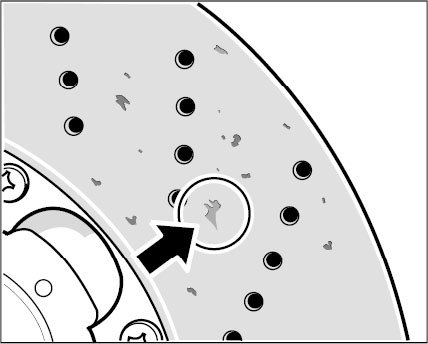 ^ The brake discs can still be used even if there is a coating on them provided that they are OK with respect to all wear criteria. The perforated bores -see illustration- must be free.