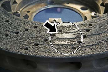 Cracks in the brake disc friction surfaces are viewed differently to cracks in cast iron brake discs. Cracks in PCCB brake discs do not constitute a wear criterion but exist already in new brake discs because of the way in which they are manufactured.
