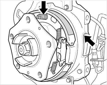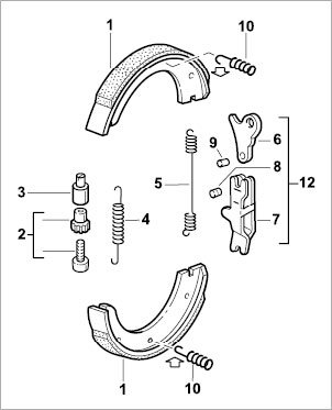 Installation: The hooks (curved ends of the spring) of the compression spring -10- on the wheel carrier are positioned (engaged) correctly when the ends of the spring are pointing towards the center of the wheel -Arrows- (pointing downwards on the top brake shoe and upwards on the bottom brake shoe). Important note! Always inspect the top compression spring visually. Use your hand to check that the bottom compression spring is seated securely.