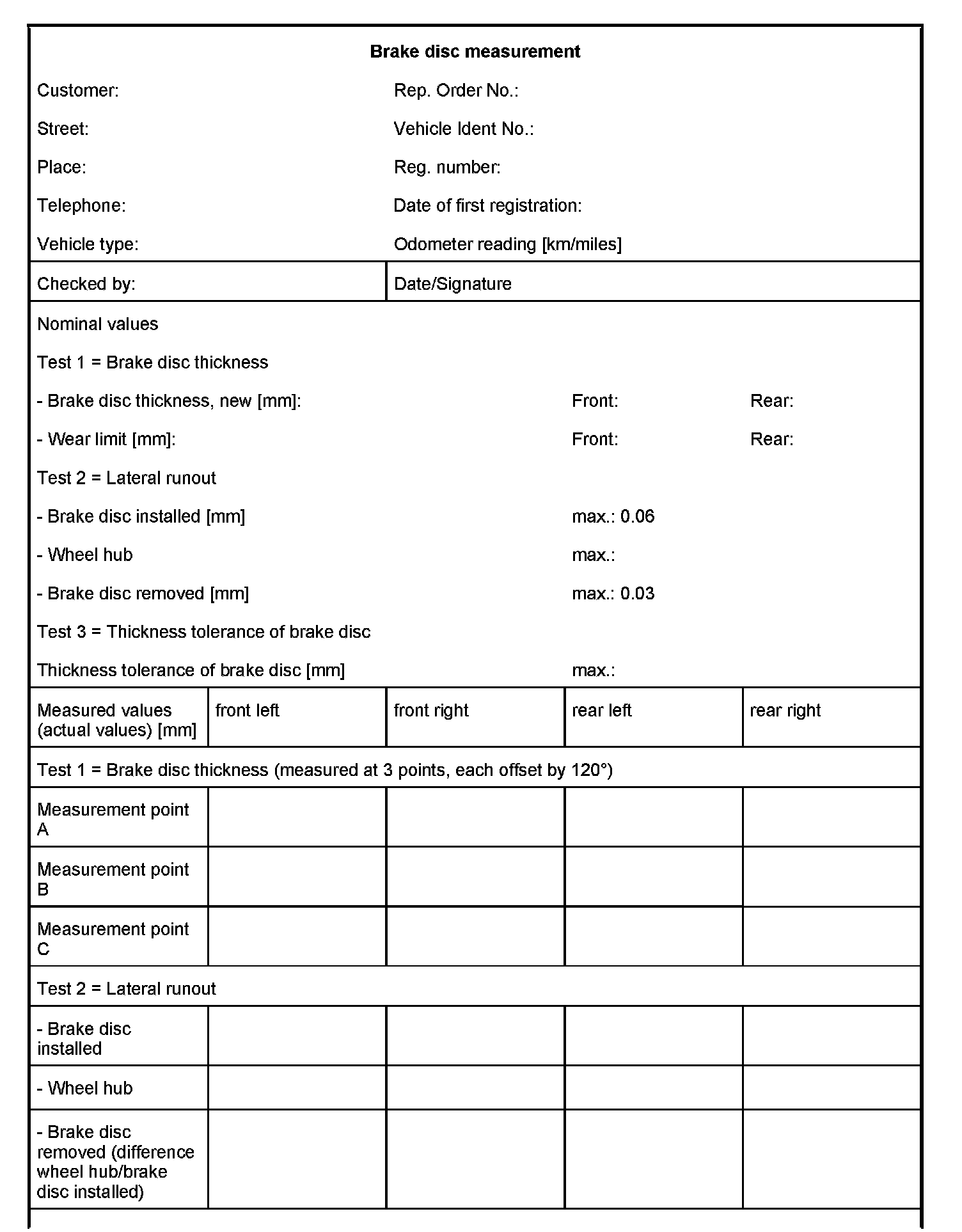 Brake disc measurement sheet
