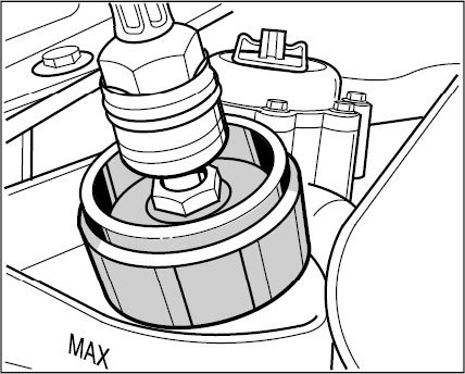16. If necessary, fill the coolant reservoir with coolant up to the maximum marking and screw on the cap of the reservoir (do not tilt).