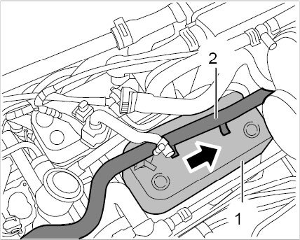 1.1. Move fuel line with plastic mounting -2- in the direction of the arrow and lay it to one side.