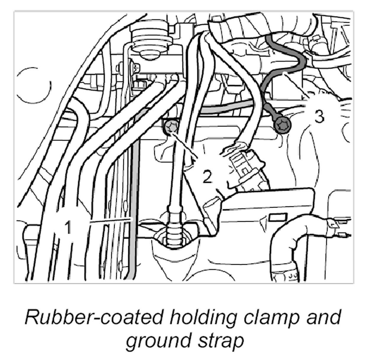 8. Fit ground strap on camshaft housing cover and rubber-coated holding clamp for oil pressure line.