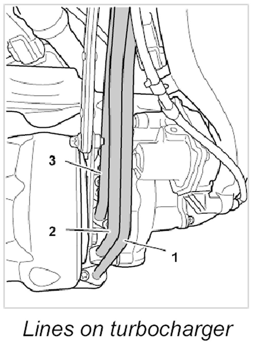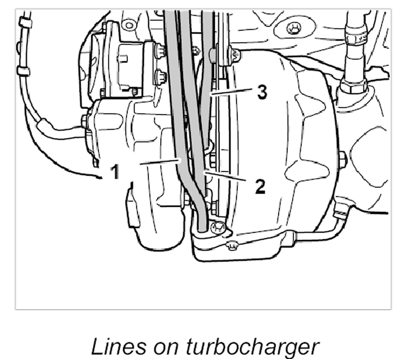 9. Loosen three lines on the turbocharger.
