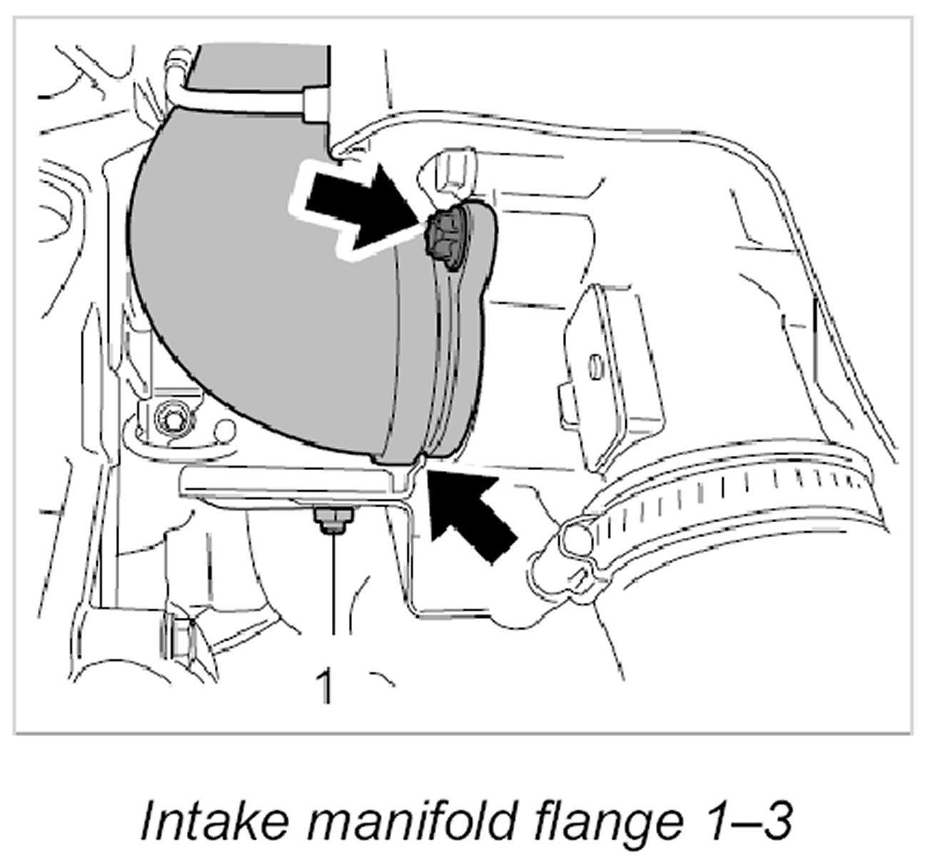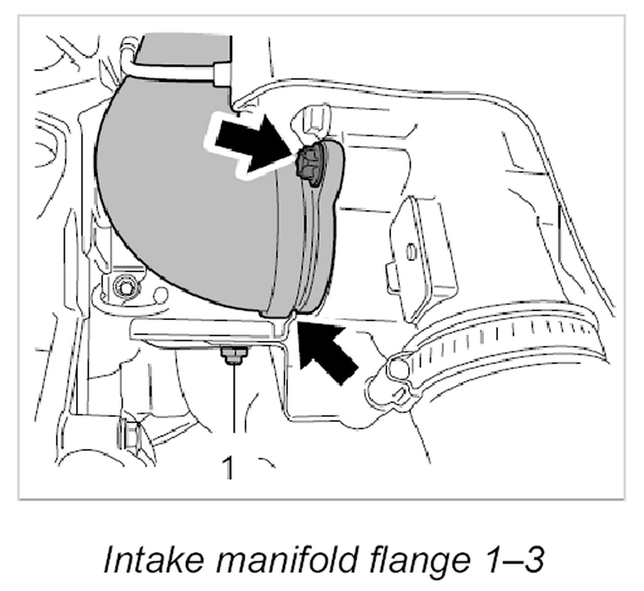 2. Fix intake manifold in place on the support in the engine compartment and then fit it on the turbocharger flange.