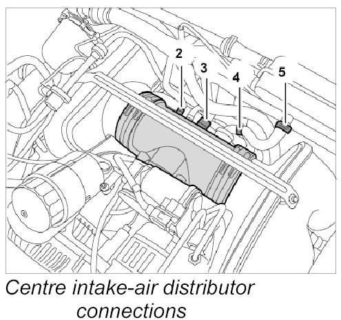 Connect line connections -2, 3, 4, 5- to the centre intake-air distributor.
