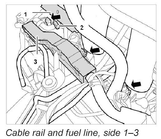 7.1. Pull cable rail -3- upwards at the fuel collection pipe and press to the side.