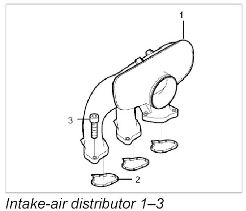 1.7. Carefully insert left intake-air distributor -1- , fit and tighten screws -3-.