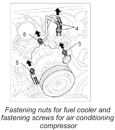 Remove three M8 screws -5-. Carefully remove compressor, place to one side together with refrigerant lines (use protective surface). If necessary, secure with a tie-wrap to prevent them from slipping.