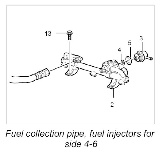 7. Remove fuel collection pipe with fuel injectors 4-6.