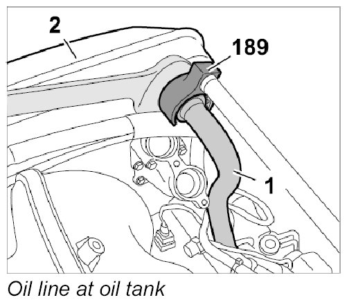 5.1. Fit union nut and secure oil line -1- to the oil tank -2- using crow foot wrench, a/f 32 Nr.189. Counter with an open-ended wrench (a/f 32) while doing this.