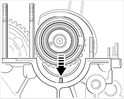 3. Allocation of the crankshaft gearwheel and intermediate shaft to the crankcase. The tolerance group number is imprinted on the crankcase -Arrow- and must match the number on the intermediate-shaft gearwheel and the crankshaft gearwheel.