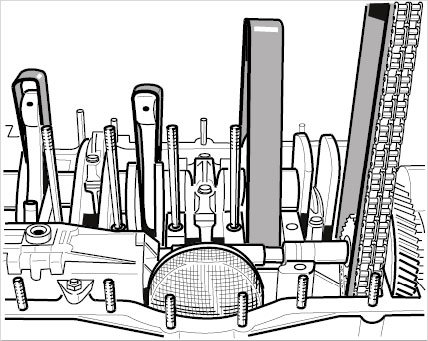 17. Insert oil pump with connecting shaft and intermediate shaft with both timing chains into the crankcase half.