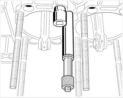 21. Prepare four through bolts. Slide sealing washers onto the through bolts. Guide lightly oiled O-rings with conical sleeve from special tool assembly sleeve 9511 over the threaded area and push them on to the conical section towards the head of the bolt.