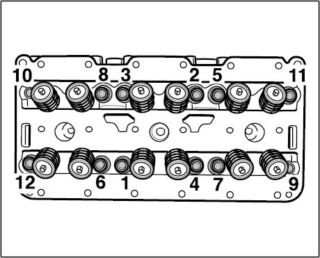 1.1. Unscrew the twelve internal-serration screws in 1/2-turn steps in the specified sequence so as to avoid distorting the cylinder head.