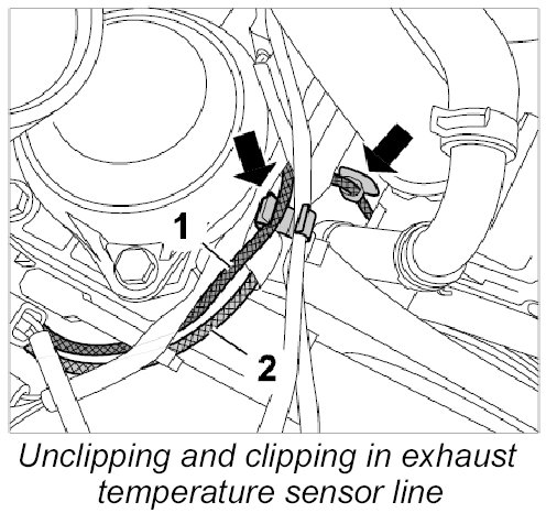 3.1. Clip in exhaust temperature sensor line on the right at the heat shield.