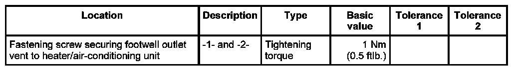2. Screw the footwell outlet vent to the heater/air-conditioning unit with the two fastening screws at the left -1- and right -2-. - Tightening torque: 1 Nm (0.5 ftlb.)