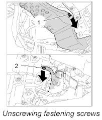 1. Unscrew the fastening screw at the left -1- and right -2- of the heater/air-conditioning unit.